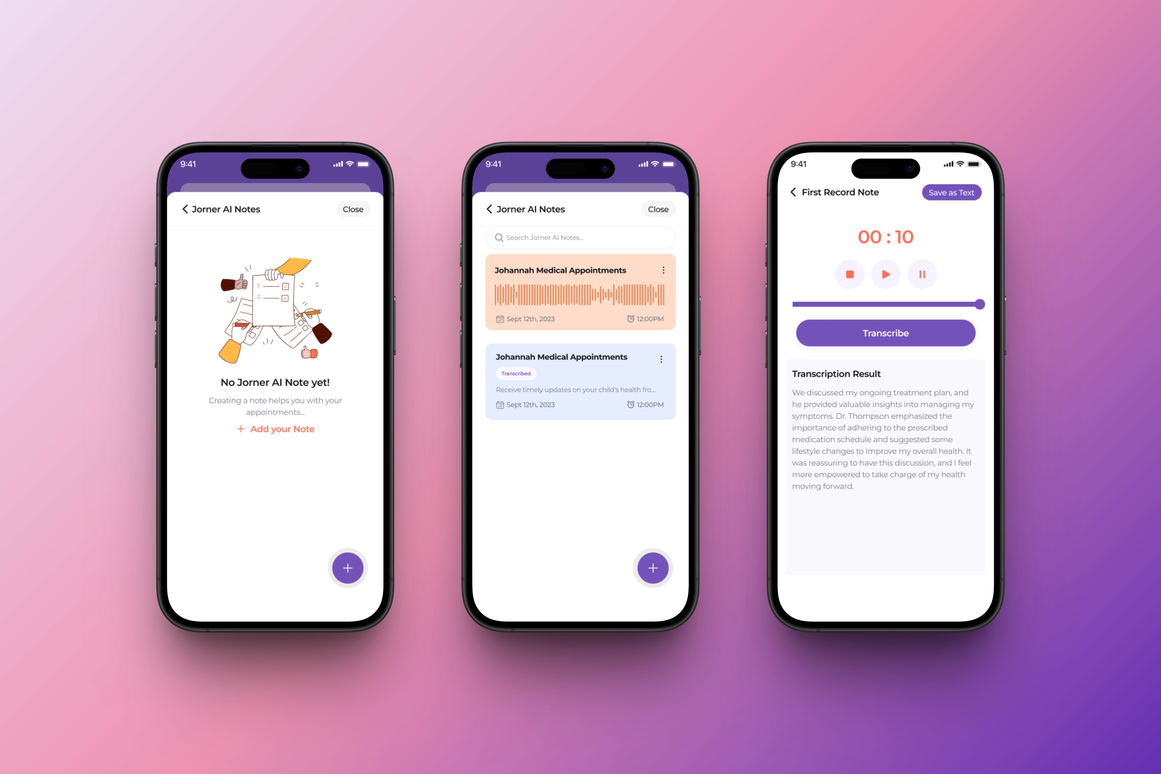 Voice Notes with Transcription: Enables caregivers to record and transcribe notes during appointments, ensuring accurate information sharing.